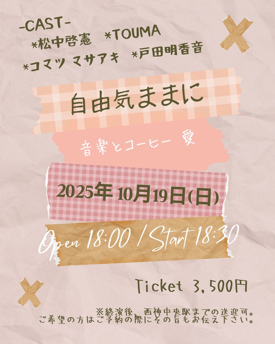 開場18:00 開演18:30 前売り¥3500 (1ドリンク別) ※当日¥500Up 【出演】TOUMA / 松中啓憲 / コマツマサアキ / 戸田明香音 【会場】兵庫 音楽とコーヒー 愛 明石駅より神姫バス36番線(三木小野社行)西戸田上より徒歩7分 神戸市営地下鉄 西神中央駅より車で10分 兵庫県神戸市西区平野町常本252-2 ここまで-----------> ここから-予約受付--> ◆ライブ予約受付開始! ※9/20(土)12:00~ ![]() ⇒ 【ご予約 は こちら!】 ※開場の10分前整列順入場・自由席 ※終演後西神中央駅までの送迎あり(ご希望の方はご予約時にその旨をお伝えください) ここまで-----------> |
