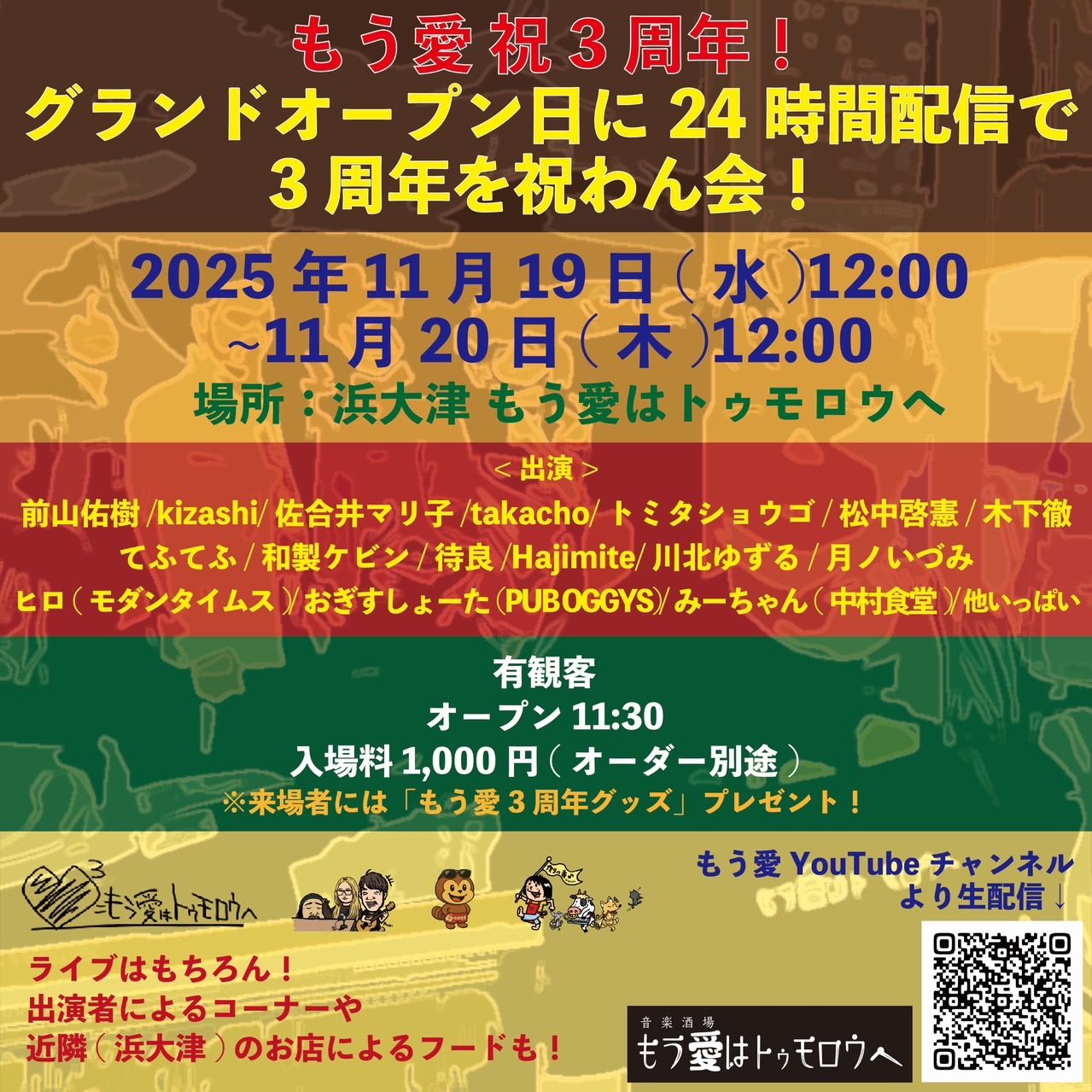 開場 11/19(水)11:30 ¥1000 別途1オーダー ※11/19(水)12:00~11/20(木)12:00の 24時間の生配信。観覧可 ※来場者には「もう愛3周年グッズ」プレゼント ※松中は11/20(木)9:00 頃の出番 【出演】前山佑樹(もう愛はトゥモロウへ 店主) / kizashi / 佐合井マリ子 / takacho / トミタショウゴ / 松中啓憲 / 木下徹 / てふてふ / 和製ケビン / 待良 / Hajimite / 川北ゆずる / 月ノいづみ / ヒロ(モダンタイムス) / おぎすしょーた(PUBOGGYS) / みーちゃん(中村食堂) / 他多数 【会場】 滋賀 大津 音楽酒場もう愛はトゥモロウへ 滋賀県大津市浜大津2丁目3-18 国松ビル1F 京阪びわこ浜大津駅より徒歩5分 ここから-配信媒体--> ◆YouTube にて ライブ配信!第1部 11/19 12:00~20:00頃 ![]() ⇒ 【ご視聴 は こちら!】 ここまで-----------> ここから-配信媒体--> ◆YouTube にて ライブ配信!第2部 11/20 20:00~4:00頃 ![]() ⇒ 【ご視聴 は こちら!】 ここまで-----------> ここから-配信媒体--> ◆YouTube にて ライブ配信!第3部 11/20 4:00~12:00頃 ![]() ⇒ 【ご視聴 は こちら!】 ここまで-----------> |
