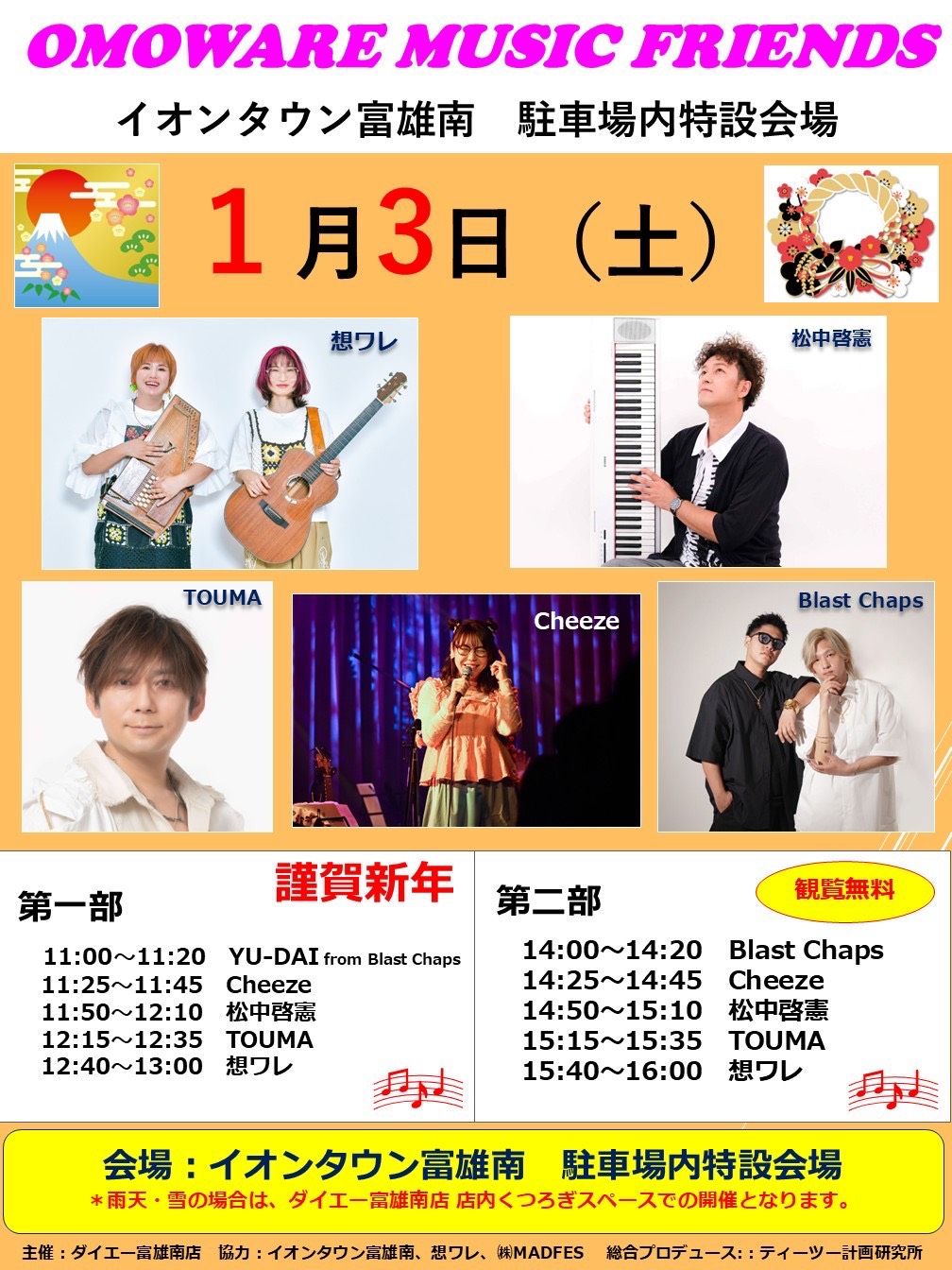 11:00~ / 14:00~ ※松中は 11:50 / 14:50 (各20分) ※観覧無料 【出演】想ワレ / TOUMA / 松中啓憲 / YU-DAI from Blast Chaps / Cheeze 【主催】ダイエー富雄南店 【協力】イオンタウン富雄南、想ワレ、(株)MADFES 【総合プロデュース】ティーツー計画研究所 【会場】奈良 イオンタウン富雄南内 駐車場内特設会場 くつろぎスペース内 特設会場 ※雨天・雪の場合は、ダイエー富雄南店 店内くつろぎスペースでの開催となります。 近鉄奈良線 学園前駅(南口)より 若草台行バスで約20分「丸山橋」下車 Tel 0742-52-6670 奈良県奈良市石木町100-1 ここまで-----------> ここから-配信媒体--> ◆ツイキャス にて ライブ配信! (音声のみ) ⇒ 【ご視聴 は こちら!】 ※アーカイブは翌日迄 ここまで-----------> |