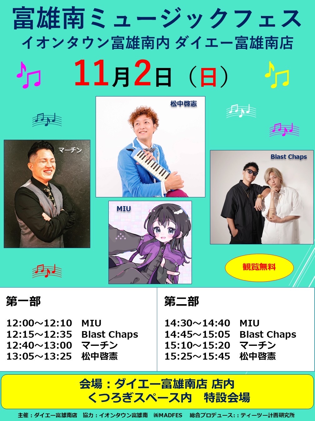 12:00 / 14:30 ※松中は 13:05 / 15:25 (各20分) ※観覧無料 【出演】MIU / Blast Chaps / マーチン / 松中啓憲 【総合プロデュース】ティーツー計画研究所 【会場】奈良 イオンタウン富岡南内 ダイエー富岡南店 くつろぎスペース内 特設会場 近鉄 学園前駅(南口)より 若草台行バス20他ky分「丸山橋」下車 Tel 0742-52-6670 奈良県奈良市石木町100-1 ここまで-----------> ここから-配信媒体--> ◆ツイキャス にて ライブ配信! (音声のみ) ![]() ⇒ 【ご視聴 は こちら!】 ※アーカイブは翌日迄 ここまで-----------> |