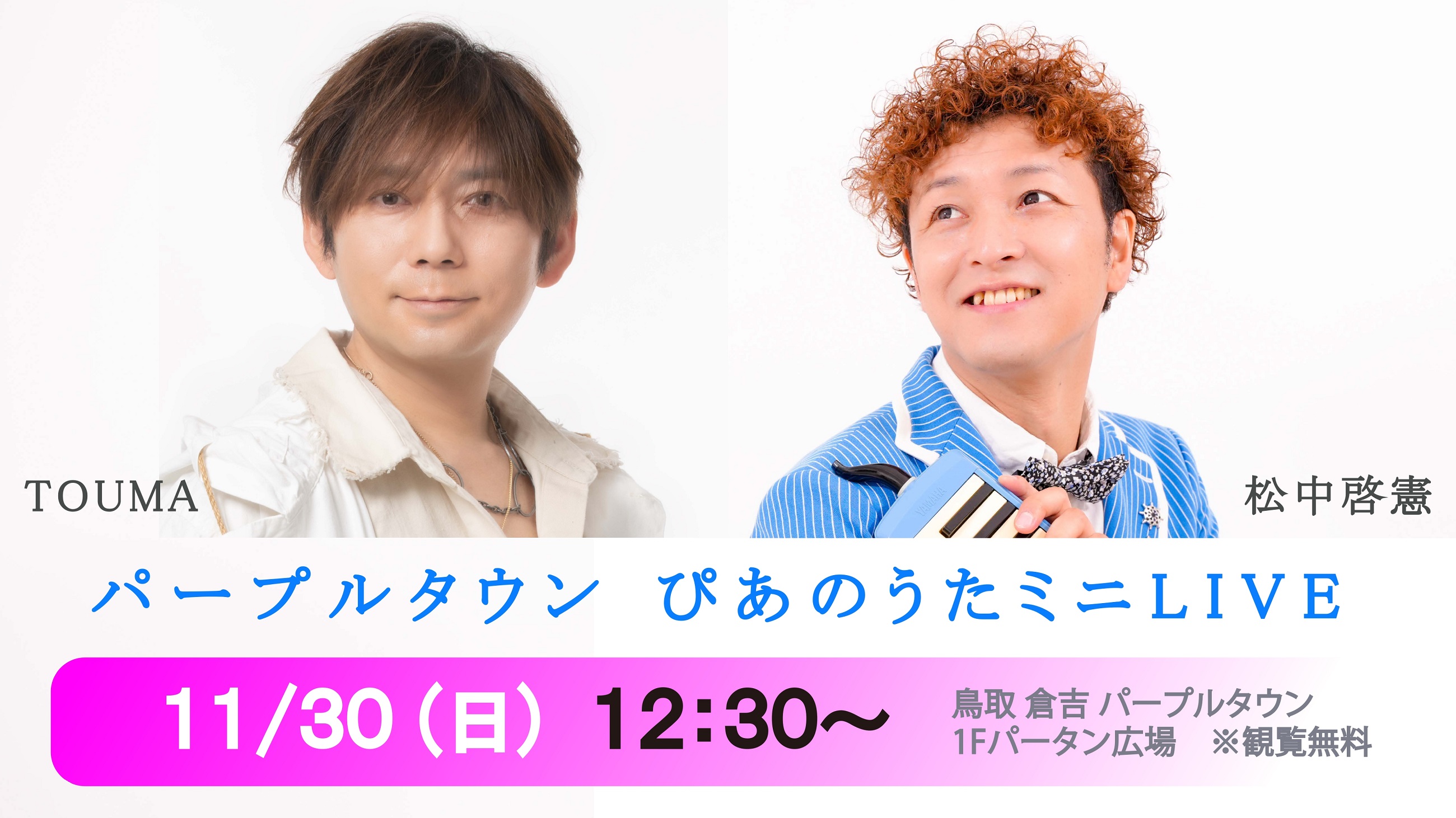 12:30 ※観覧無料 【出演】松中啓憲 / TOUMA 【会場】 鳥取 倉吉パープルタウン 1F中央パータン広場 JR倉吉駅より徒歩10分 Tel 0858-26-5111 鳥取県倉吉市山根557-1 ここまで-----------> ここから-配信媒体--> ◆ツイキャス にて ライブ配信! (音声のみ) ![]() ⇒ 【ご視聴 は こちら!】 ※アーカイブは翌日迄 ここまで-----------> |