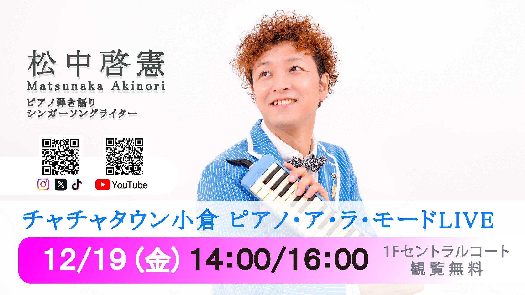 14:00 16:00 ※観覧無料 ※屋外。雨天時は場所変更する場合があります。荒天中止。 【出演】松中啓憲 【会場】 福岡 北九州 チャチャタウン小倉 1Fセントラルコート JR小倉駅から徒歩約8分 Tel 093-513-6363 福岡県北九州市小倉北区砂津3-1-1 ここから-配信媒体--> ◆ツイキャス にて ライブ配信! (音声のみ) ここまで-----------> ここから-配信URL---> ⇒ 【ご視聴 は こちら!】 ※アーカイブは翌日迄 ここまで-----------> |