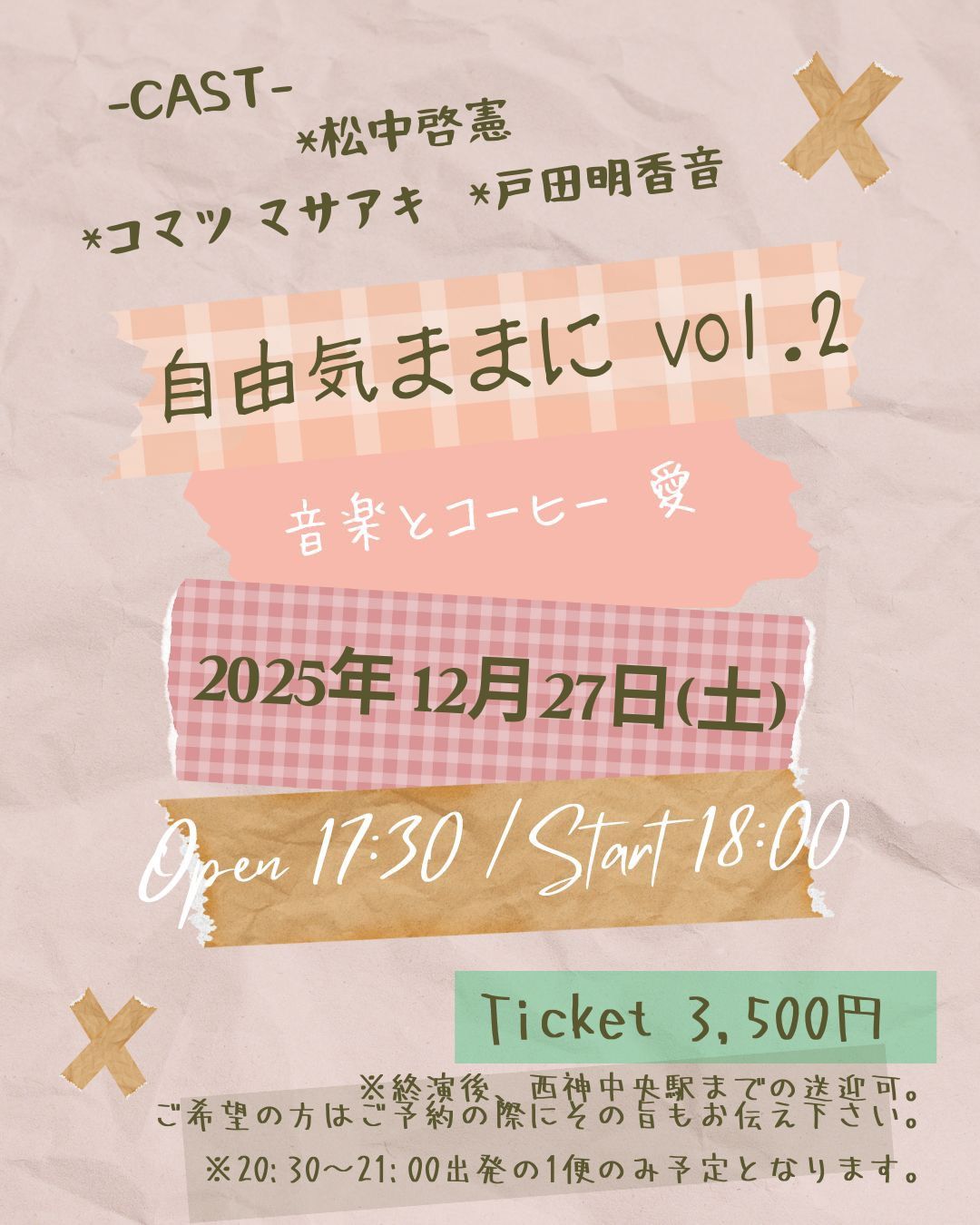 開場17:30 開演18:00 前売り¥3500 (1ドリンク別) ※当日¥500Up 【出演】コマツマサアキ / 戸田明香音 / 松中啓憲 【会場】兵庫 音楽とコーヒー 愛 明石駅より神姫バス36番線(三木小野社行)西戸田上より徒歩7分 神戸市営地下鉄 西神中央駅より車で10分 兵庫県神戸市西区平野町常本252-2 ここまで-----------> ここから-予約受付--> ◆ライブ予約受付開始! ※11/20(木)12:00~ ⇒ 【ご予約 は こちら!】 ※10分前整列順入場 ※ご希望の方は、【西神中央駅】より送迎いたします。ご予約時にご連絡下さい。 ここまで-----------> ここから-配信媒体--> ◆ツイキャスプレミア(有料配信) にて ライブ配信! ここまで-----------> ここから-配信URL---> ⇒ 【ご購入・ご視聴 は こちら!】 ※ご指名アーティスト(松中啓憲)をご記入下さい。 ※購入期限 1/3(土)迄 ※視聴期限 1/10(土)迄 (配信日以降購入の場合、購入日より14日間) ここまで-----------> |