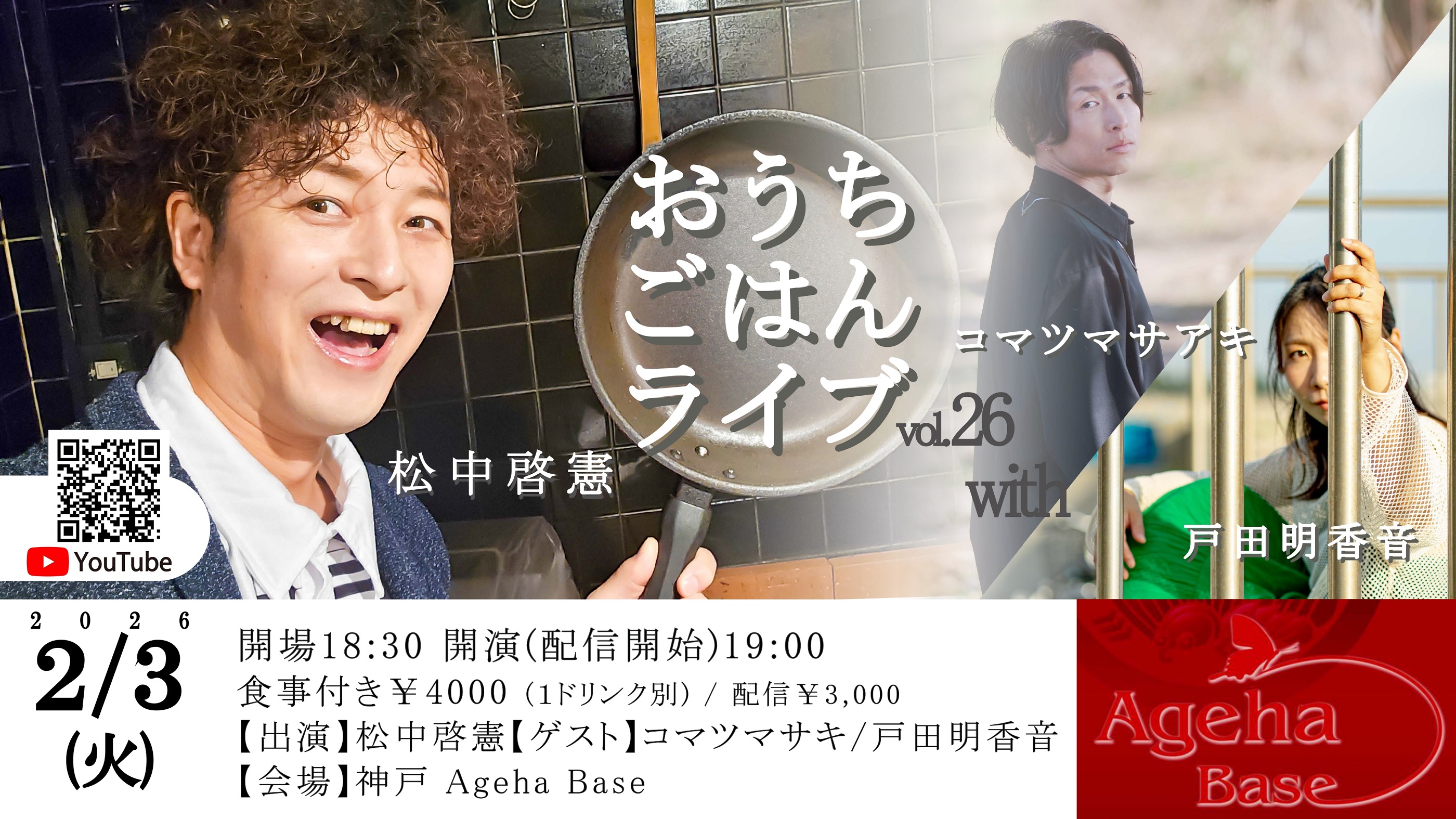 開場18:30 開演(配信開始)¥19:00 前売り¥4000 (1ドリンク別) ※手作りお食事付(メイン1品+ごはん+汁物 etc) ※当日¥500Up / 配信¥3000 ※お料理の作成時間は Ageha Base ツイキャス(無料配信) から (17:00-17:30 予定) 別途無料配信予定です 【出演】松中啓憲 【ゲスト】コマツマサアキ / 戸田明香音 【会場】神戸 Ageha Base 神戸市中央区下山手通2-1-4 KWビルB1F 各線三ノ宮駅より徒歩5分 Tel 078-321-1729 (空海) ここまで-----------> ここから-予約受付--> ◆ライブ予約受付開始! ※1/7(水)21:00~ ⇒ 【ご予約 は こちら!】 ここまで-----------> ここから-配信媒体--> ◆ツイキャスプレミア(有料配信) にて ライブ配信! ここまで-----------> ここから-配信URL---> ⇒ 【ご購入・ご視聴 は こちら!】 ※ご指名アーティスト(松中啓憲)をご記入下さい。 ※購入期限 2/10(火)迄 ※視聴期限 2/17(火)迄 (配信日以降購入の場合、購入日より14日間) ここまで-----------> |